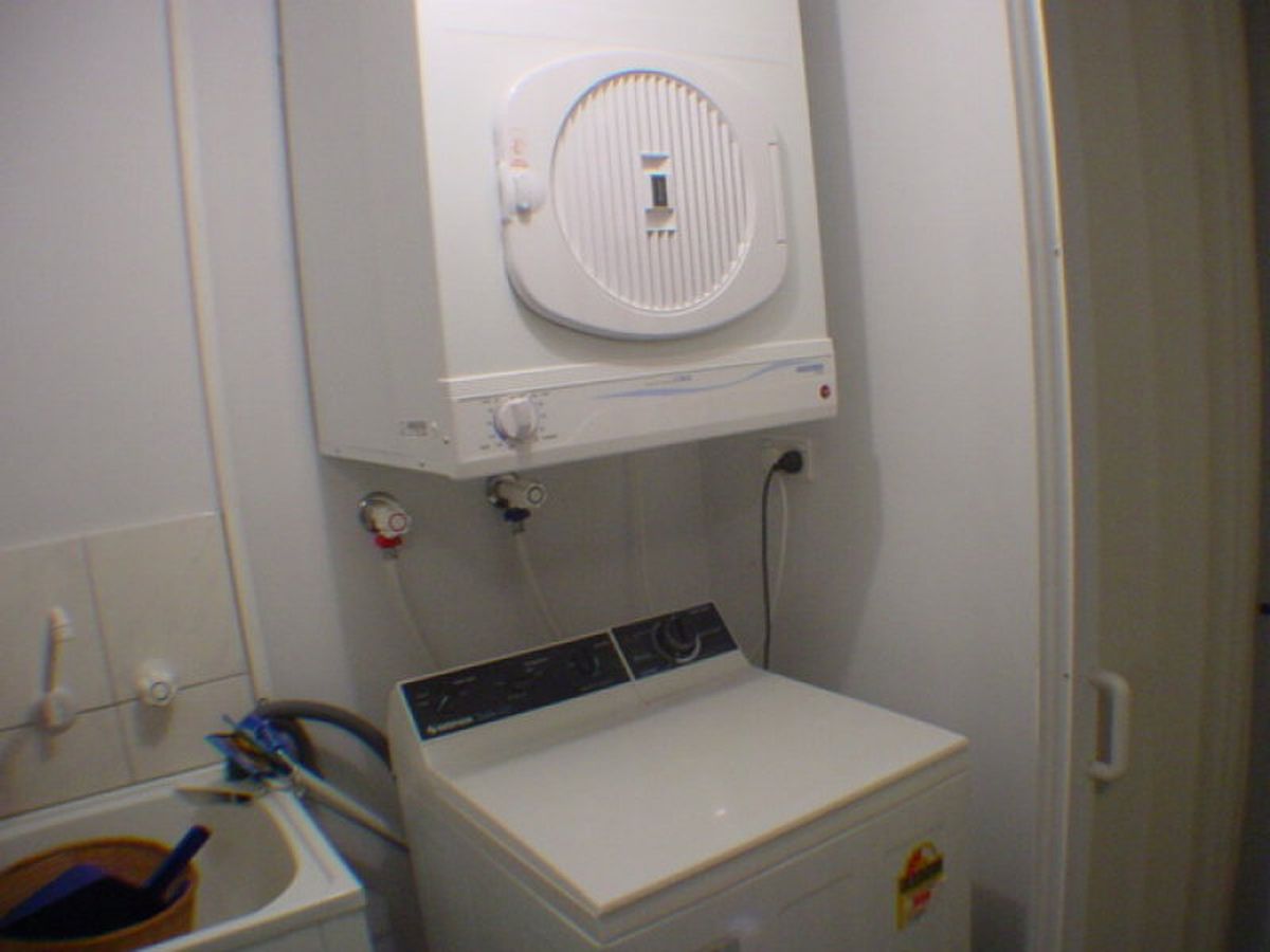 Furniture includes: two beds, two sofas, dining setting, washing machine and dryer.